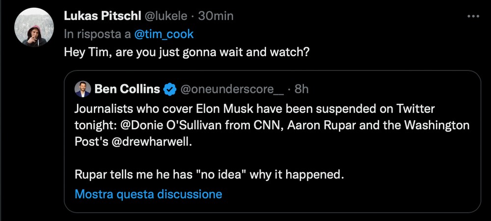 The matter is not limited to Mastodon, since Twitter – and in particular Musk – took the opportunity of the entry into force of the new rules to going to suspend the accounts of several journalists for 7 days uncomfortable for the new platform ownerincluding those of The Washington Post’s Drew Harwell, MSNBC’s Keith Olbermann, The New York Times’ Ryan Mac, CNN’s Donie O’Sullivan, Mashable’s Matt Binder, and Aaron Rupar.