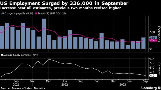 US employment unexpectedly surged in September, illustrating a durable labour market and bolstering the case for another Federal Reserve interest-rate hike.